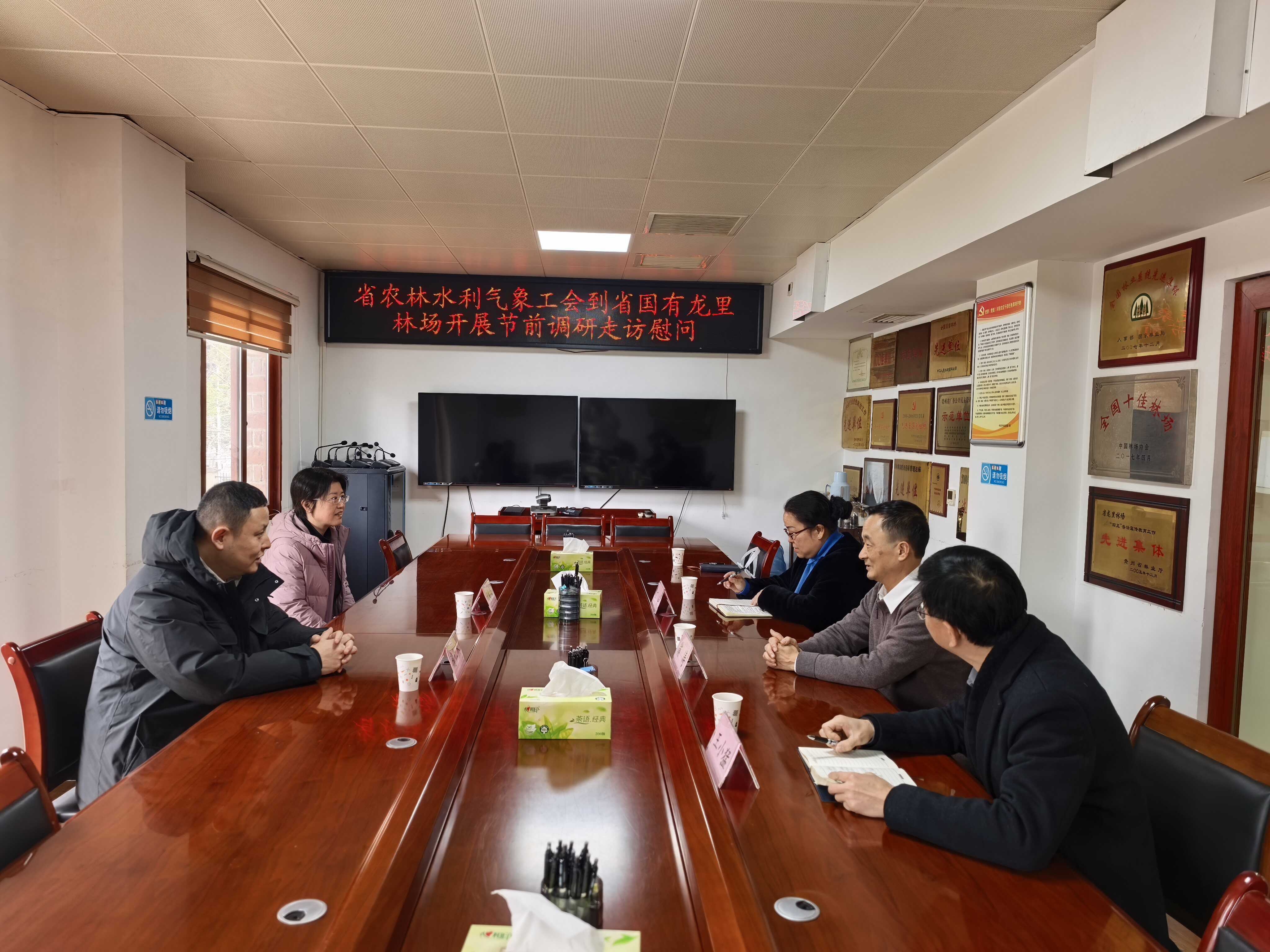 1月28日下午,贵州省农林水利气象工会主席庞仁杰一行赴省国有龙里林场开展节前调研走访慰问,场党委副书记、场长翁涛,工会主席王小猛陪同。