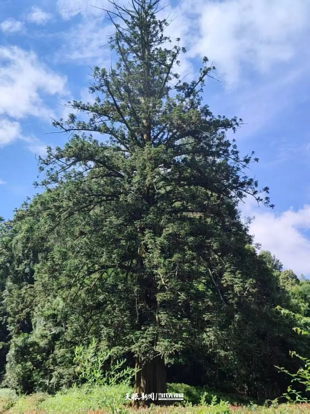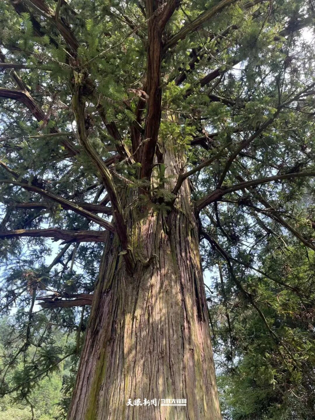 如今的“杉王”,树高44.8米,胸围744厘米,需七八个人牵手合围;东西冠幅21米、南北冠幅27米,如巨伞遮荫,生机盎然。
