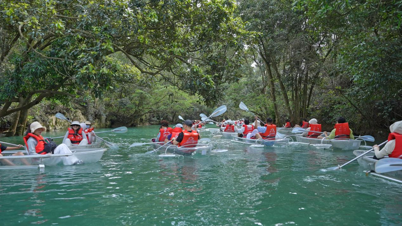 “我们就是在网上刷到玻璃船视频被‘种草’,特地赶来体验的。得益于贵州省的优惠政策,我和同事还享受了免票。”来自天津某小学的王老师分享道,小七孔风光旖旎、美景如画,尤其那翡翠般的湖水,澄澈碧绿,养眼又养心。茂密的原始森林环抱四周,乘一叶玻璃船徜徉其间,仿佛进入人间秘境,随手一拍都是大片。