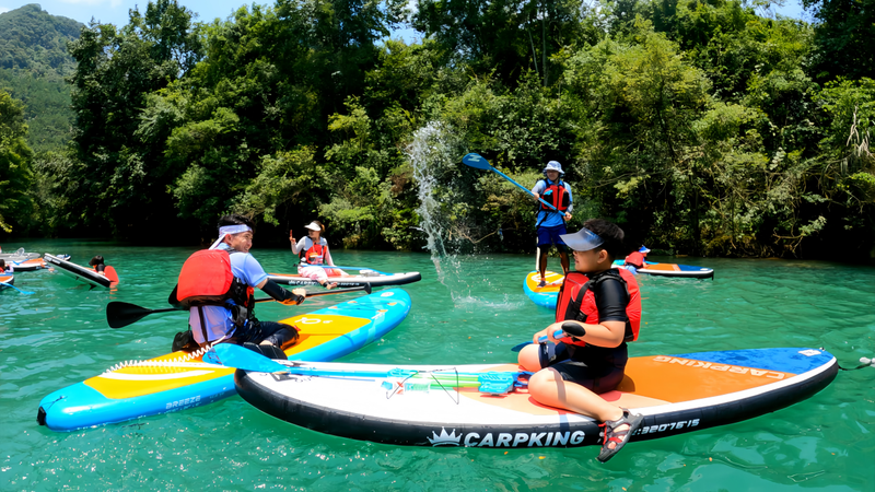 教练陈红凯是贵州本地人,大学就读于社会体育指导与管理专业。毕业后,一直在江浙地区从事水上运动指导。如今,他回到家乡,在小七孔景区担任背包船、皮划艇等多个热门项目的教练。“独特的地理位置和地貌,两岸的原始植被,都是天然优势。”曾带队到全国多地体验过户外运动的陈红凯认为,贵州,才是户外运动的“天然乐土”。