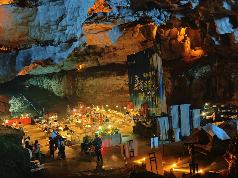 地心洞穴餐厅里,又是另一番景象:清汤牛肉火锅蒸腾起阵阵热气,与洞中氤氲的水雾交织。牛女士与队员们围坐吃火锅时,新一批探险者正借“溜索穿行”进入溶洞,开启他们的地心之旅。