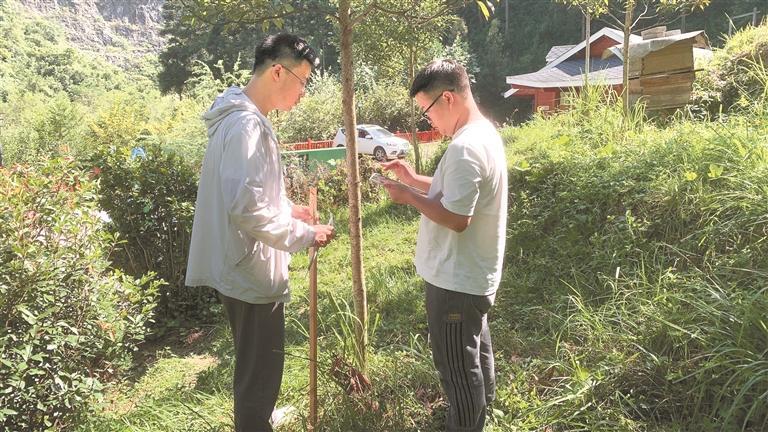 工作人员在铜仁市江口县德旺乡测量要进行“活立木交易”的楠木树。 李雪雪 摄