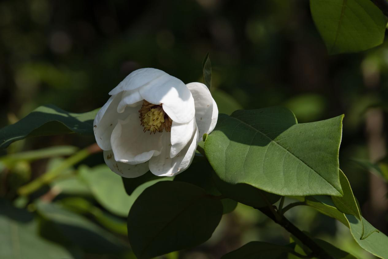 圆叶天女花为木兰科天女花属植物,为落叶灌木至小乔木,树高达6米。该树种花期5月-6月,花型硕大,具沁人的芳香味。开花时花瓣洁白,散生于绿叶丛中,晶莹艳丽,宛如“天女散花”,因叶近圆形,故称“圆叶天女花”。该植物的树皮的药用价值与厚朴相似,其树形优美,花形独特,具观赏价值,是野生珍贵种质资源。