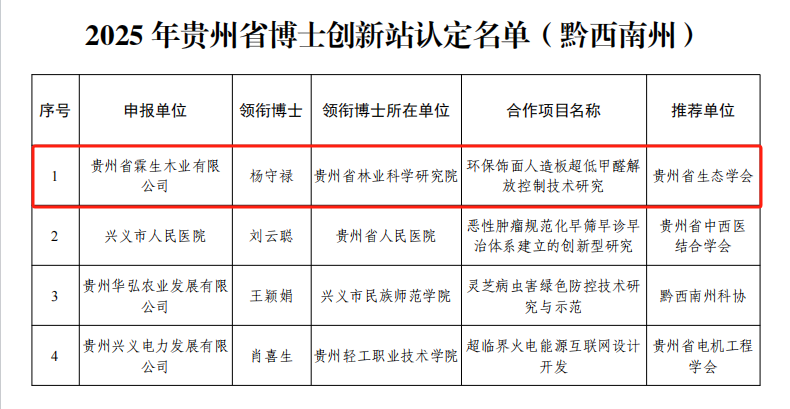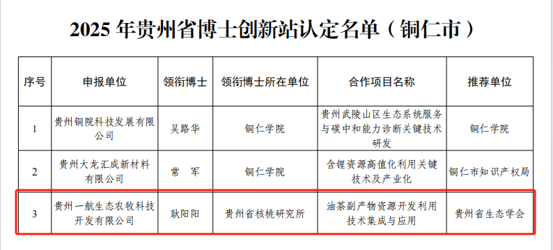 近日,贵州省科学技术协会、贵州省知识产权局、贵州省工商业联合会、贵州省民营经济和区域经济发展中心等4部门联合印发《关于认定2025年贵州省博士创新站的通知》,发布了2025年贵州省博士创新站认定名单,其中贵州省生态学会推荐的杨守禄、耿阳阳两名博士领衔申报的创新站均成功获得认定。