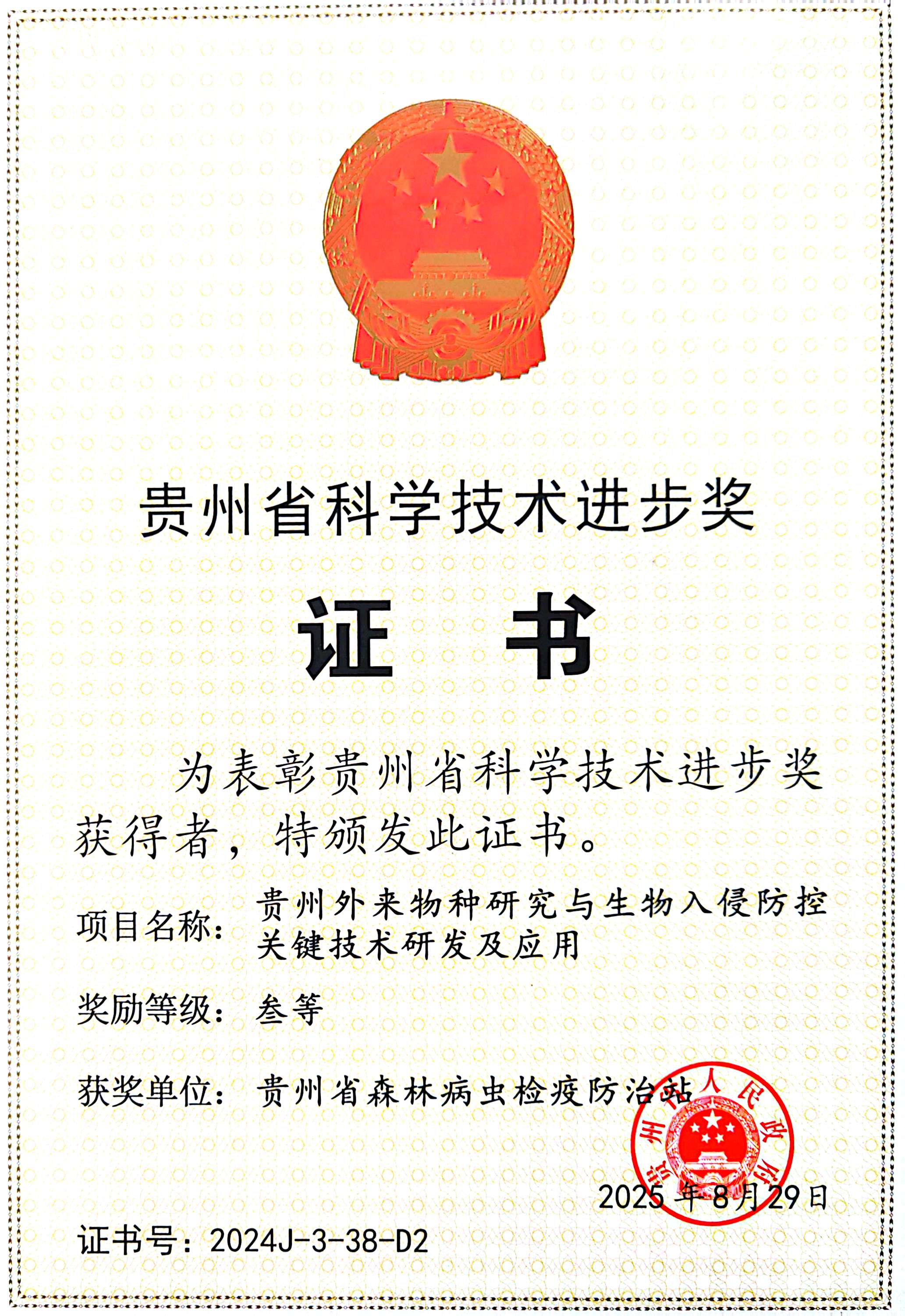 近日,贵州省人民政府颁布2024年度贵州省科学技术进步奖证书,贵州省森林病虫检疫防治站(以下简称“省检疫站”)参与的《贵州外来物种研究与生物入侵防控关键技术研发及应用》项目喜获叁等奖,这是省政府对全省外来生物入侵防控领域工作成效的高度肯定 。