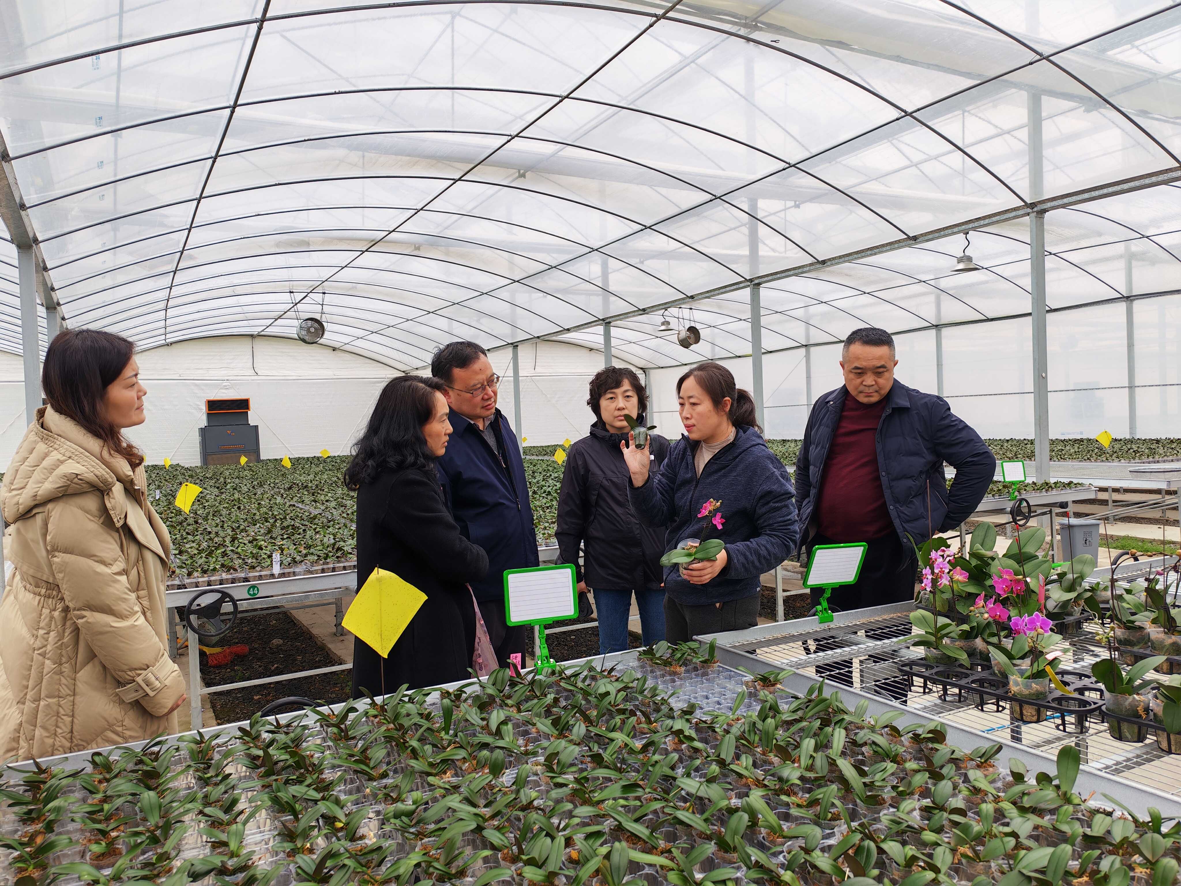 图为考察组在宿迁市沭阳县蝴蝶兰基地考察