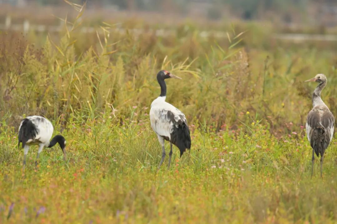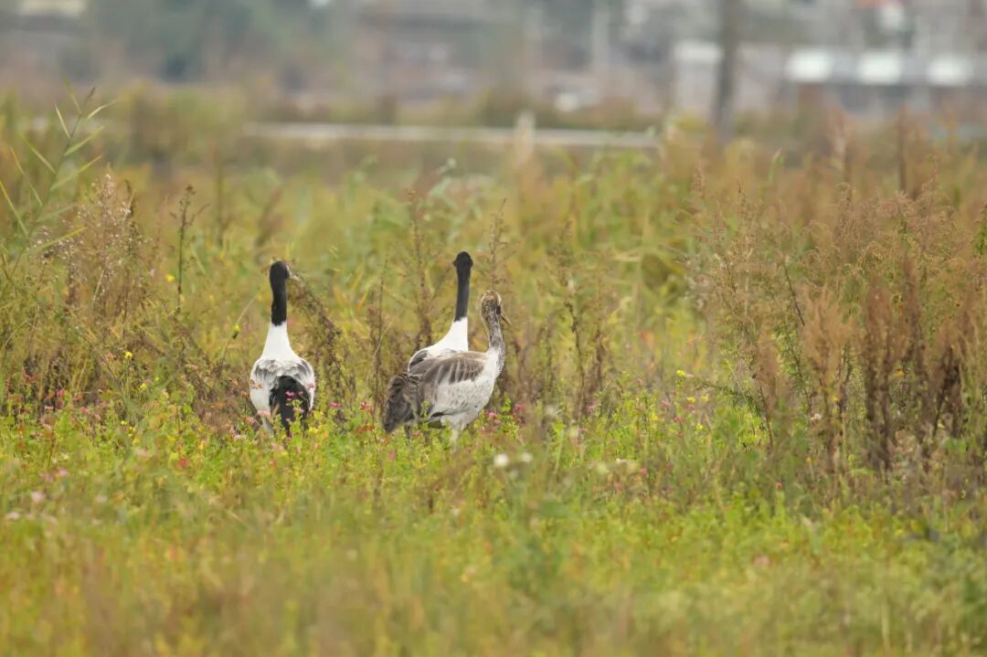 2024年11月3日上午11时,威宁草海管委会管护员在温家屯栖息地发现3只越冬候鸟黑颈鹤,属于“一家三口”,比2023年首批飞抵草海的时间晚两天。