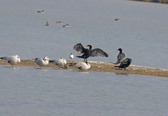 反嘴鹬栖于湖心浅滩,混在普通鸬鹚群与斑头雁群中埋头休憩,时而因鸬鹚振翅的响动骤然惊醒。夜鹭与红嘴鸥交错展翼于湖面半空,始终保持低空飞行姿态,活力十足。